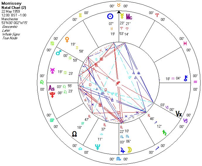 Morrissey has his Mars in Cancer and he is kno for his....well, slightly moody, lyrics. He was also born during a full Moon, so emotions may often be runnning high!