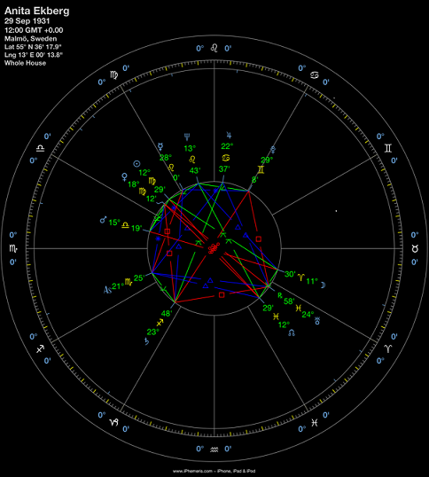 Anita Ekberg, the Swedish model and actress has her Moon in Aries, with the ruler of the sign, Mars in opposition.