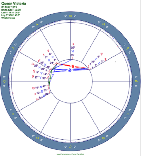 The Sun rules her house of home, land and country, so she deeply identified with her homeland on all levels, most importantly on an emotional one. The sign of Taurus is aspected by expansive Jupiter who sits in the area of global wisdom in her chart. Her reign was marked by a great expansion of the British Empire which during this period reached its peak.
